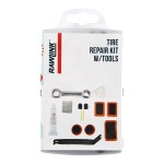 Kit reparación pinchazos con herramienta, 14 piezas incluye: 1 llave inglesa fija multiple, 1 tubo de pegamento, 2 palancas de plástico para neumáticos, 2 válvulas, 2 tapones de válvula, 1 raspador, 5 gomas para cámara (2 de 30 x 25, 1 de 50 x 30, 2 de ø25 mm)
