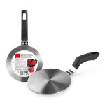 Adaptador inducción vitrocerámica, fabricado en acero inoxidable con mango de baquelita, permite utilizar en fuegos de inducción cafeteras de fondo liso que no son aptas para inducción por sí solas, no utilizar sin recipiente encima, no usar como grill, no utilizar cafeteras que dejen al descubierto más de 2 cm por cada lado del adaptador ø12 cm