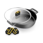 Olla baja de aluminio fundido con antiadherente tricapa de gran calidad teflon innovation, libre de pfoa, con tapa de cristal y pomo de baquelita. apta para todas las fuentes de calor. fondo de gran espesor, sus asas tienen unas agarraderas de silicona extraíbles, con detalles en color amarillo. apta para horno hasta 220°c ( sin tapa ni asas), ø 28 cm