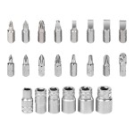 Mini carraca, juego 24 puntas y vasos de 1/4" incluye: microtornillador de carraca de 95 mm con llave de 8 mm 6 vasos métricos hexagonales 6, 7, 8, 10, 11 y 12 mm barra de extensión para puntas 60 mm 1 adaptador para vasos 15 puntas de 25 mm (1"): 4 puntas phillips ph0, ph1, ph2, ph3 4 puntas planas: 4, 5.5, 6.5 y 7 mm 4 puntas pozi pz0, pz1, pz2, pz3 3 puntas cuadradas s1, s2, s3