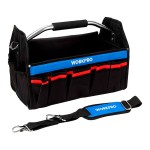 Bolsa de herramientas plegable 41 x 23,5 x 27 cm. poliéster 600d. con asa metálica y correa ajustable, ideal para transportar herramientas manuales y otros artículos pequeños y medianos. con apertura superior para facilitar el acceso de las herramientas. bolsillos exteriores para guardar objetos personales, herramientas pequeñas y accesorios. negra, azul y roja