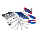 Asiento con ruedas de dos cajones que contiene: 1 ud alicates de punta larga de 160 mm 5 uds llaves combinadas (8,10,11,13 y 15 mm) 9 uds llaves hexagonales 1 ud mango portapuntas magnético 60 puntas cr-v de 25 mm 1 ud mango de carraca de 3/8 8 uds vasos métricos (8,9,10,11,12,14,15 y 16 mm) 8 uds vasos sae (5/16,3/8,7/16,1/2,9/16,5/8,11/16 y ¾ pulg) 1 ud barra de extensión 75 mm 1 ud vaso para bujías de 3/8 pulg 16 mm 40 uds brida para cables